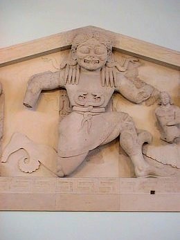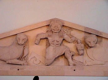 Le fronton en pierre provenant du temple dorique d'Artémis est gigantesque et unique en son genre. Il mesure 17 mètres de large et plus