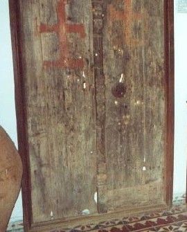 La porte du réfectoire où 36 combattants trouvèrent la mort.On peut distinguer les trous faits par les balles.