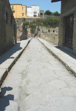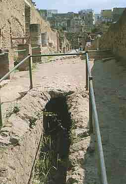 A l'époque d'Auguste, on pava les rues avec des pierres polygonales de lave et de calcaire. En géréral, les rues ne présentent pas de traces de passage de véhicule, exception faite du 'decamanus' inférieur. Le transport des marchandises vers le port et la mer se faisait à dos de mulet ou au moyen de porteurs. |