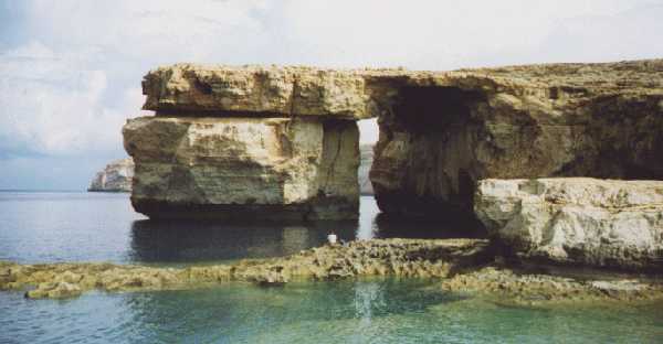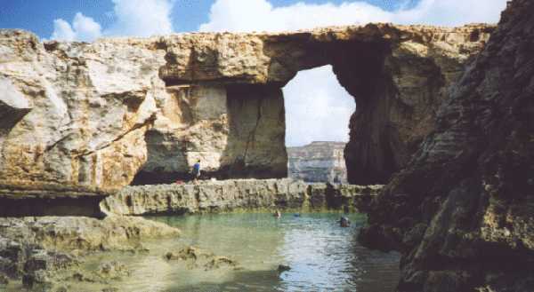La FENETRE "ZERKA" , connue aussi sous le nom "AZURE WINDOW" est une imposante arcade naturelle surplombant la mer |