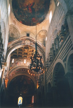 maritime de Pise en 1063. Le plafond à caissons remplace le plafond origina détruit par l'incendie de 1595. C'est sans nul doute ur travail remarquable, mais le contraste avec les lignes simples et sévères du roman pisan est trop criant.