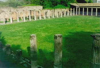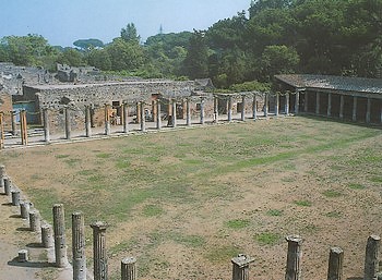 Après le tremblement de terre de l'an 62, cet ensemble perdit sa destination d'origine et fut transformé en caserne de gladiateurs; on mura l'entrée monumentale et l'on plaça un corps de garde près d'une porte. On créa également à cette époque d'autres pièces, sur deux étages. Au nord-est se trouvait le secteur réservé aux repas: la salle à manger, c'est-à-dire une grande exèdre précédée de quatre piliers, et une grande cuisine avec des dépôts à proximité. A l'étage au-dessus se trouvait l'appartement du lanista, chargé de l'instruction des gladiateurs; ceux-ci logeaient dans les cellules aménagés le long des côtés du portique. |