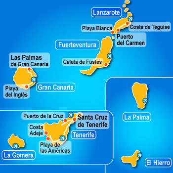 L'archipel des Canaries, situé à 115 km à l'ouest des côtes du Maroc, dans l'océan Atlantique est composé de sept îles et de quatre îlots, les îles de Tenerife, la Grande Canarie, La Palma, La Gomera, El Hierro, Lanzarote et Fuerteventura.